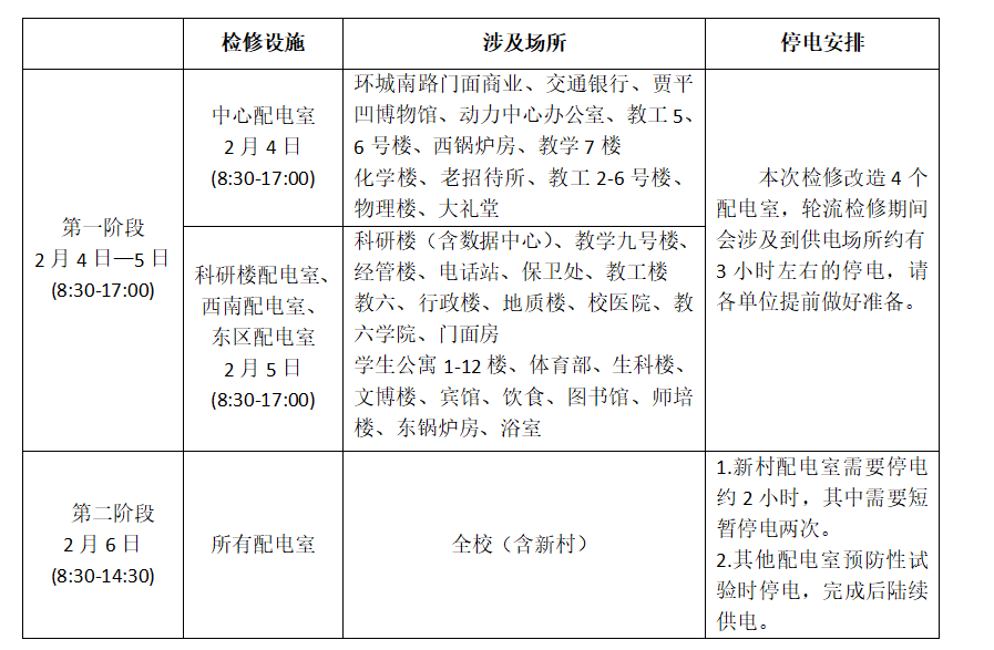 为进一步提升我校太白校区电力系统运行效能,增强供电保障能力,更好地为全校师生教学科研及生活用电提供可靠服务,经与国网西安市区供电公司协商,我校计划2月42月6日对太白校区供电设施进行检修改造并进行预防性试验。